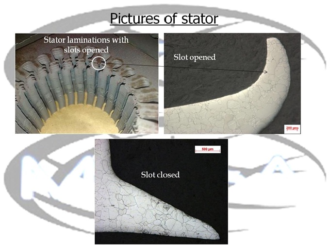Pictures of stator laminations with Y opened to allow the insertion of the copper wires, micro-structure of a slot opened and slot closed. The process of opening and closing does not damage the Y if the lamination is well heat treated.